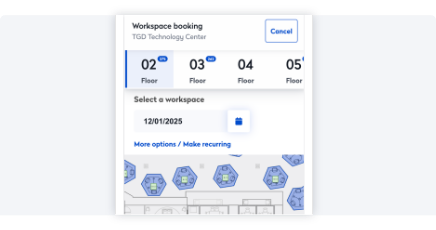 Book rooms and desks, find colleagues, and manage services in one place. Employees get a smoother experience, and managers get better visibility into how spaces are used.
